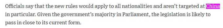 對此,有美媒炒作,英國政府提出新法案是由於擔心中、俄等潛在“敵對國家”對英國國家安全造成“威脅”。不過,英國官員表示新規則將適用於所有國家,並非特別針對中國。