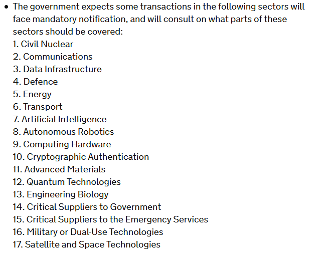 按照新法案提出的收購規則,凡涉及核能、通訊、人工智能、交通、能源和國防等17個領域的交易,投資者都必須向英國政府作出通報。