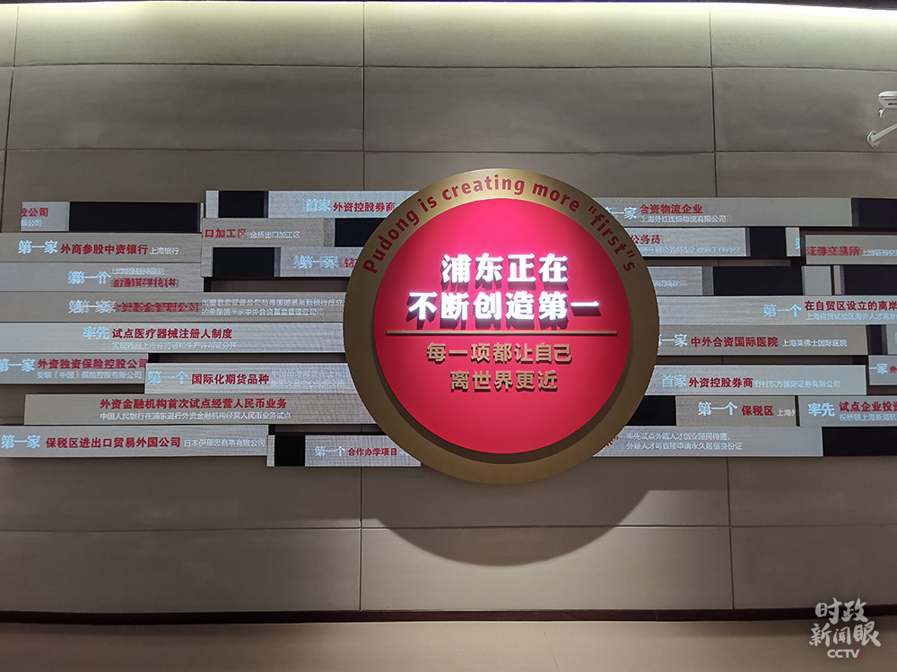△“浦東開發開放30週年主題展”列出了浦東新區建設的多項“第一”。(總枱央視記者王冰拍攝)