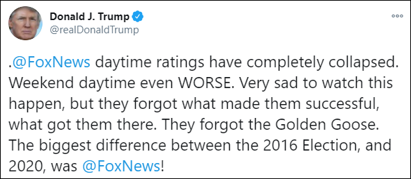 特朗普繼續抱怨,“他們(福克斯新聞)忘記了‘金鵝(Golden Goose)的故事’。2016年大選和2020年大選最大的不同是福克斯新聞!”