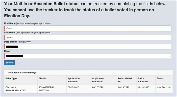 根據投票記錄顯示,賓夕法尼亞州8月25日將選票郵寄給了桑茲,選票又於10月15日被寄回。《紐約時報》指出,目前尚不清楚查詢網站上的信息是何時更新的。