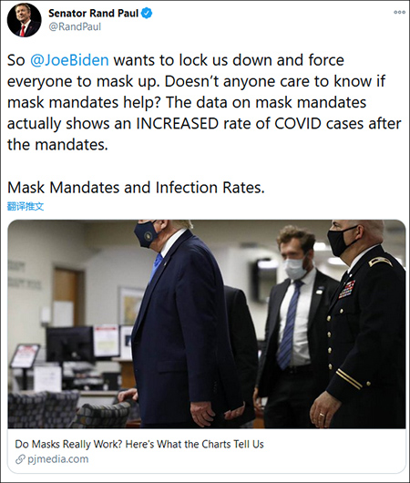 對福克斯新聞吹完“免疫”後,保羅似乎還覺得不滿意,他隨後又在推特上宣傳起了“口罩無用論”,批評拜登推行的“口罩強制令”,聲稱“發佈口罩強制令的地方感染率都在上升”。