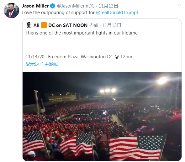 12日,特朗普的競選顧問傑森·米勒(Jason Miller)開心地轉發了一條支持集會的推文,並稱“超愛大家對特朗普源源不斷的支持!”