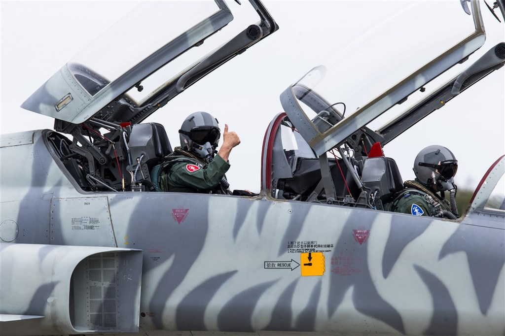 台軍F-5F戰機順利執行預定空中課目後,在上午9時30分降落,滑回停機坪。