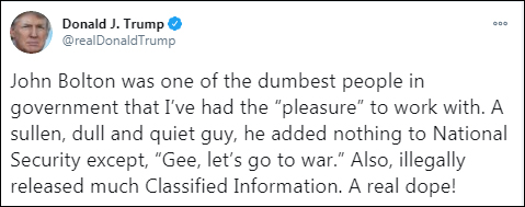 對於博爾頓15日接受採訪,特朗普當晚在推特上不客氣地“開炮”,直呼博爾頓是“我‘有幸’共事過的官員中最愚蠢的人之一”。
