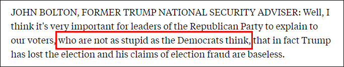 博爾頓15日出現在ABC的節目中,討論特朗普不承認敗選對美國國家安全造成的負面影響。被問到如何看待數千名特朗普支持者14日在華盛頓特區舉行“讓美國再次偉大百萬大遊行”時,博爾頓喊話共和黨,希望他們“教育”選民,承認特朗普已經“失敗”: