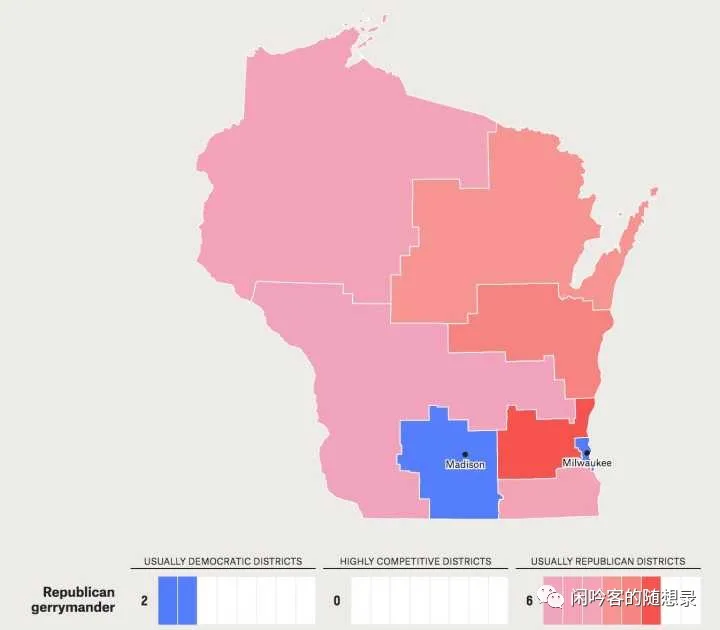 舉個例子,在兩黨大致均勢的威斯康辛,一共有8個議席。如果讓共和黨來gerrymander,其結果大概是6:2。