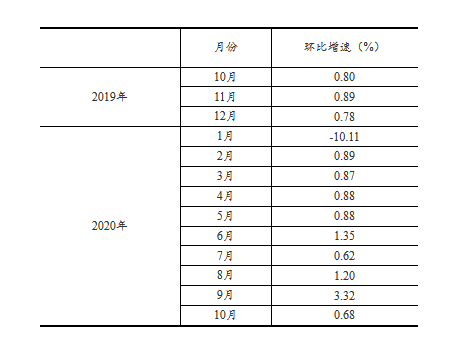 根據季節調整模型自動修正的結果,對2019年10月份以來的社會消費品零售總額環比增速進行修訂。修訂結果及2020年10月份環比數據如下: