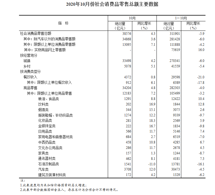 國家統計局11月16日發佈消息,2020年10月份社會消費品零售總額增長4.3%。