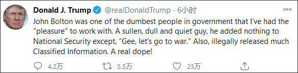 特朗普寫道:“約翰·博爾頓是我在政府中‘有幸’遇到過的最蠢的人之一。他是個陰沉、無趣且沉默寡言的人,從來不談國家安全,只會説‘我們去打仗吧’。這人還非法散佈機密信息,是個真正的蠢貨!”