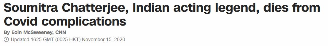 (觀察者網訊)當地時間11月15日,CNN報道稱,印度85歲印度傳奇演員查特吉(Soumitra Chatterjee)因確診新冠肺炎併發症於當天去世。