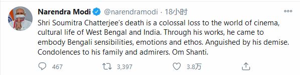 印度總理莫迪當天發佈推文感嘆道,“查特吉的去世是西孟加拉邦和印度電影、文化生活的巨大損失。”