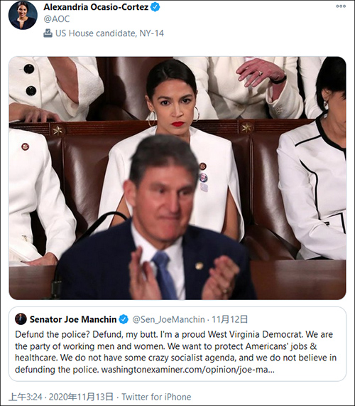進步派的代表人物科爾特斯在推特上發了張“怒視曼欽”的照片。以表明自己絕不認同曼欽觀點的立場。個別激進的進步派人士更是怒斥温和派“只對吸引白人選民感興趣”。