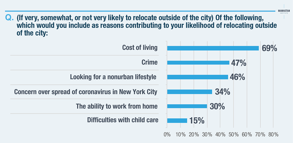 曼哈頓研究所於今年7、8月曾對年收入6位數的紐約市居民進行一項民意調查。結果發現,44%的受訪者在此前四個月曾考慮過搬離紐約市。其中最大的原因在於不斷攀升的生活成本。