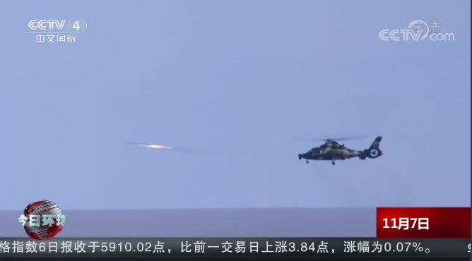 據《解放軍報》11月16日報道,金秋,某海域,第71集團軍某旅直升機海上實彈射擊考核傳來喜報:在濃霧籠罩的惡劣條件下超視距實彈射擊全部命中目標。
