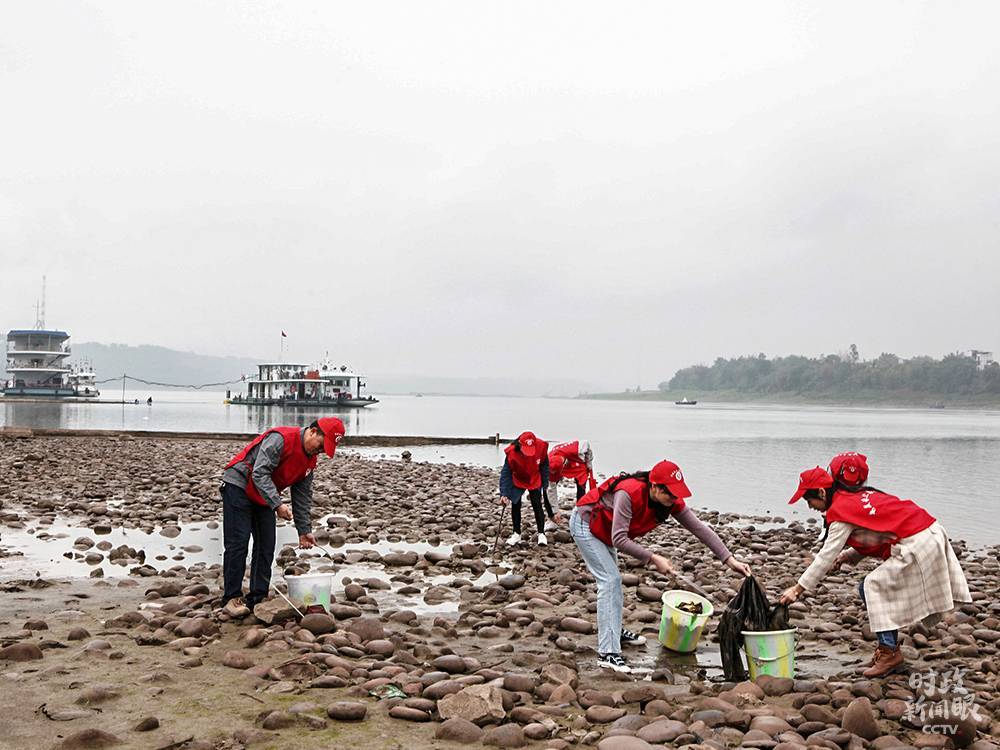 △重慶永川區志願者在長江朱沱段撿拾垃圾。