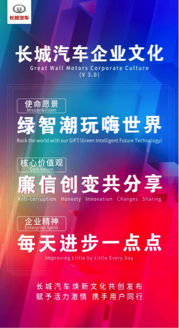未來,在“綠智潮玩嗨世界、廉信創變共分享、每天進步一點點”這21個字的全新企業文化賦能下,長城汽車將繼續聚焦“以用户為中心”的發展方向,全力踐行走向世界的全球化戰略,在更多領域展開大刀闊斧的改革、細緻入微的調整,持續推進長城汽車由“中國汽車製造企業向全球化科技出行公司”轉型的步伐。