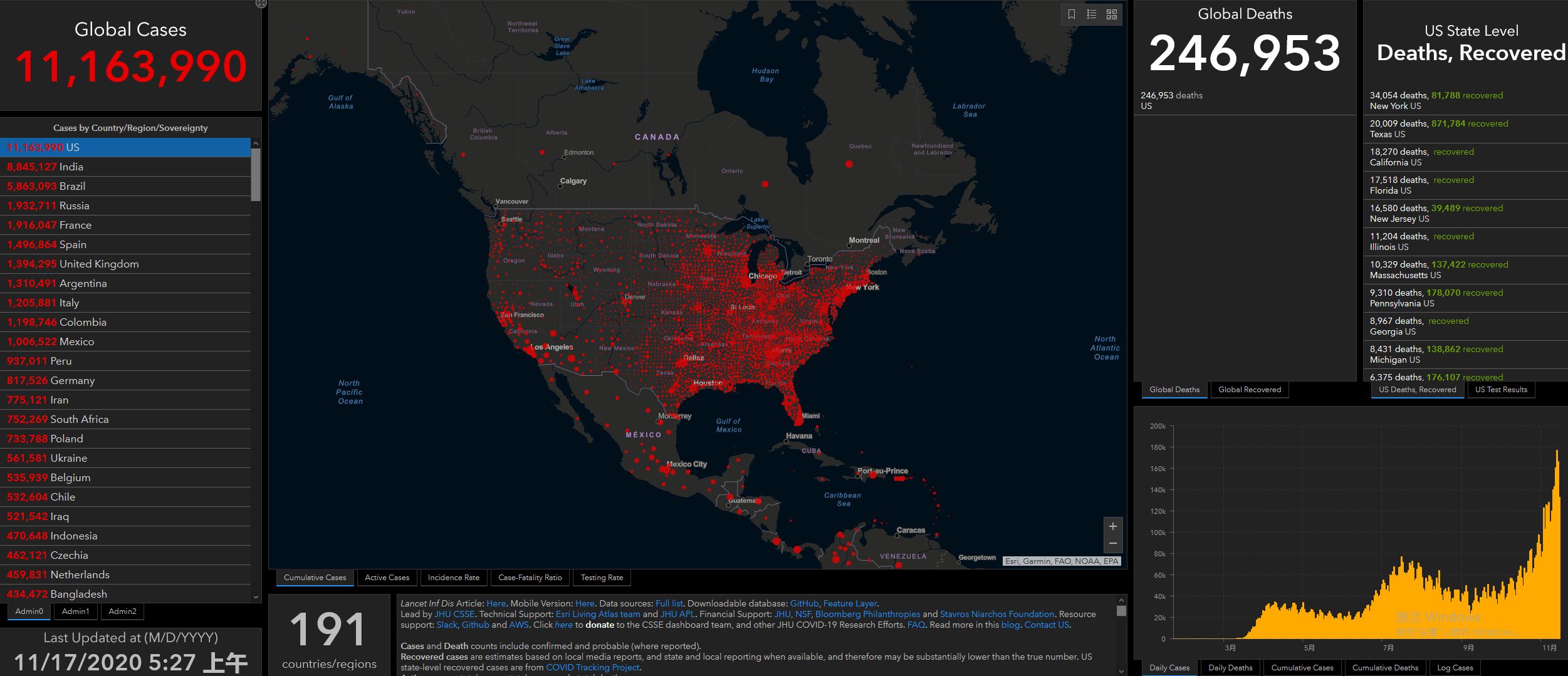 (觀察者網訊)根據美國約翰斯·霍普金斯大學實時數據,截至北京時間11月17日5時27分,美國累計新冠確診病例11163990例,累計死亡246953例。過去24小時,美國新增確診病例163006例,新增死亡病例943例。