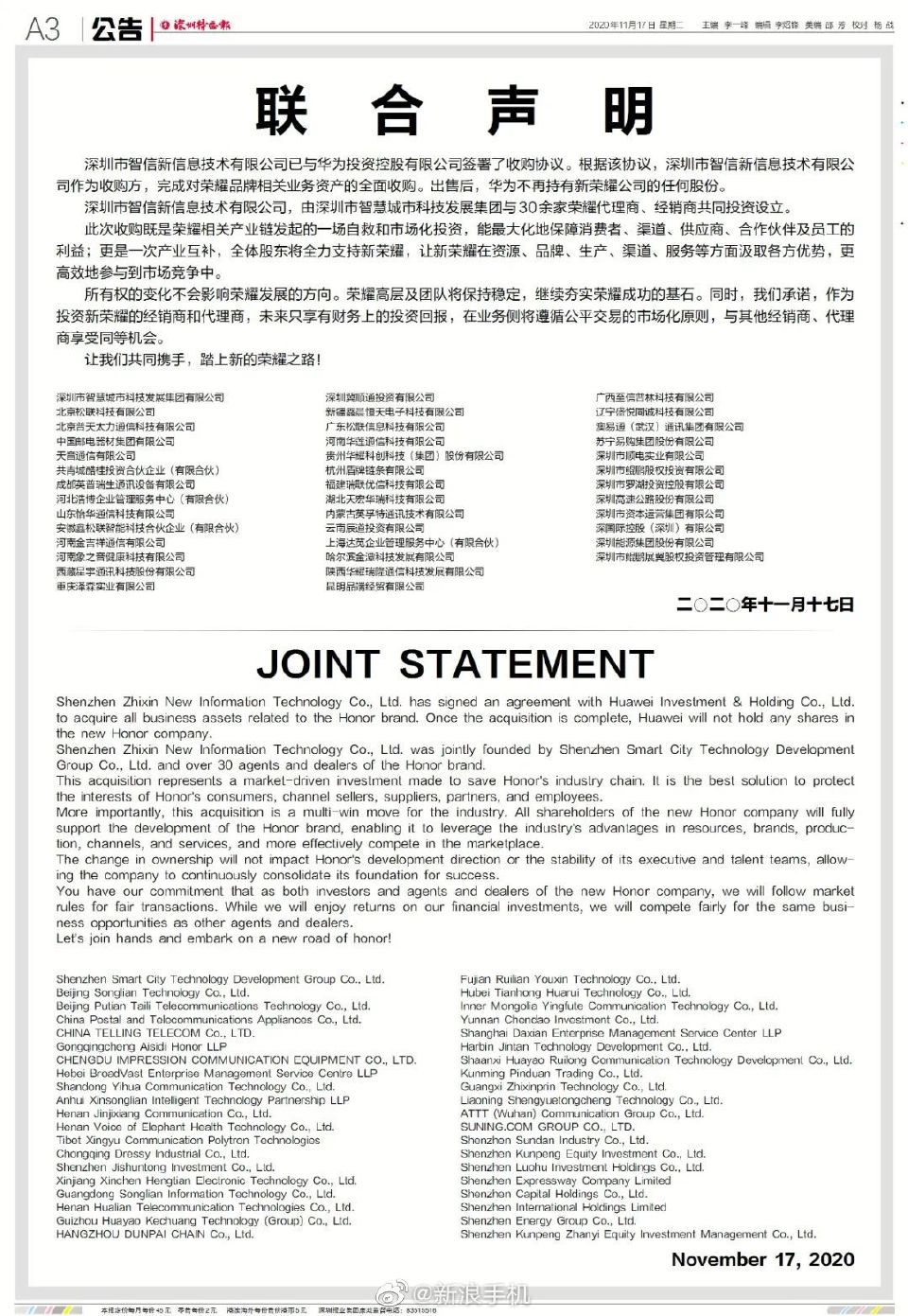 11月17日上午,《深圳特區報》上刊登一則相關方的聯合聲明:深圳市智信新信息技術有限公司(簡稱“深圳智信”)已與華為投資控股有限公司簽署了收購協議。根據該協議,深圳市智信新信息技術有限公司作為收購方,完成對榮耀品牌相關業務資產的全面收購。出售後,華為不再持有新榮耀公司的任何股份。