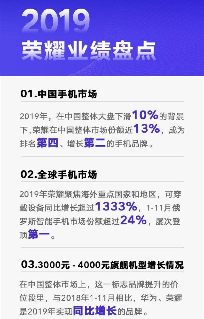 2017年,榮耀以5450萬部的銷量、789億元的銷售額,登上中國互聯網手機第一的寶座;2018年,榮耀同比增長率超過30%;2019年,榮耀在國內的整體市場份額達到13%。