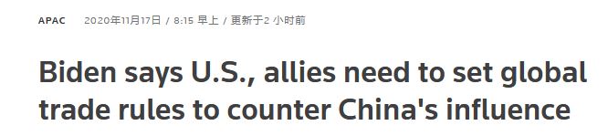 (觀察者網訊)當地時間11月17日,路透社報道稱,美國“當選總統”拜登表示,美國必須與盟友磋商並制定全球貿易規則,以應對中國日益增長的影響力。他拒絕表明是否會讓美國加入包括中國在內的區域全面經濟夥伴關係協定(RCEP)。