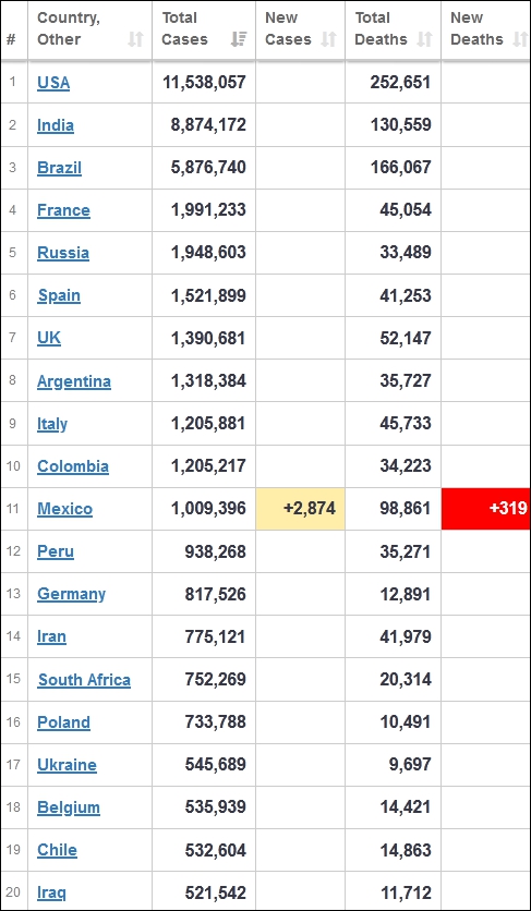 Worldometer網站統計的全球新冠肺炎累計確診數前20的國家