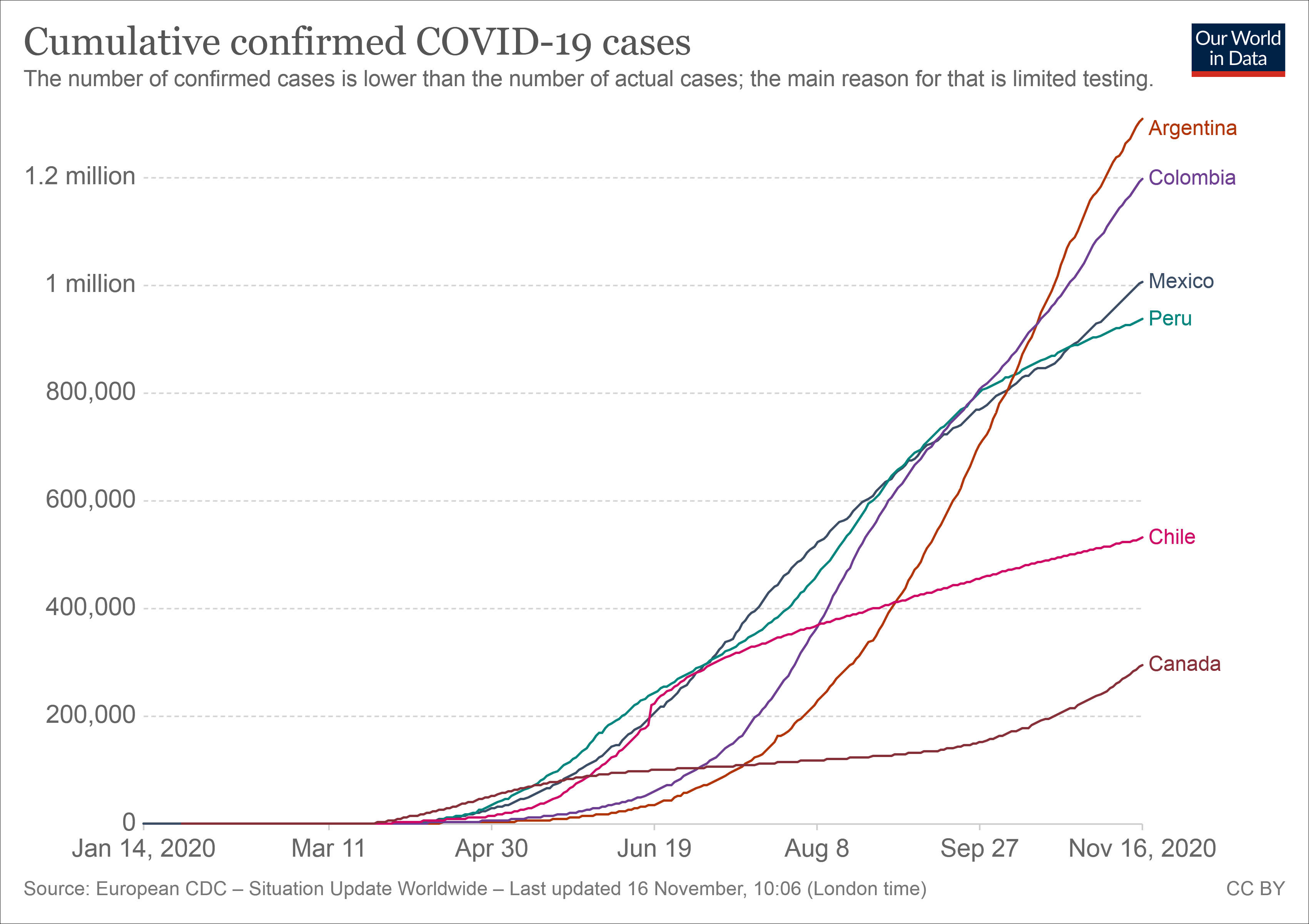 (從上到下)阿根廷、哥倫比亞、墨西哥、秘魯、智利、加拿大的新冠肺炎累計確診數據變化