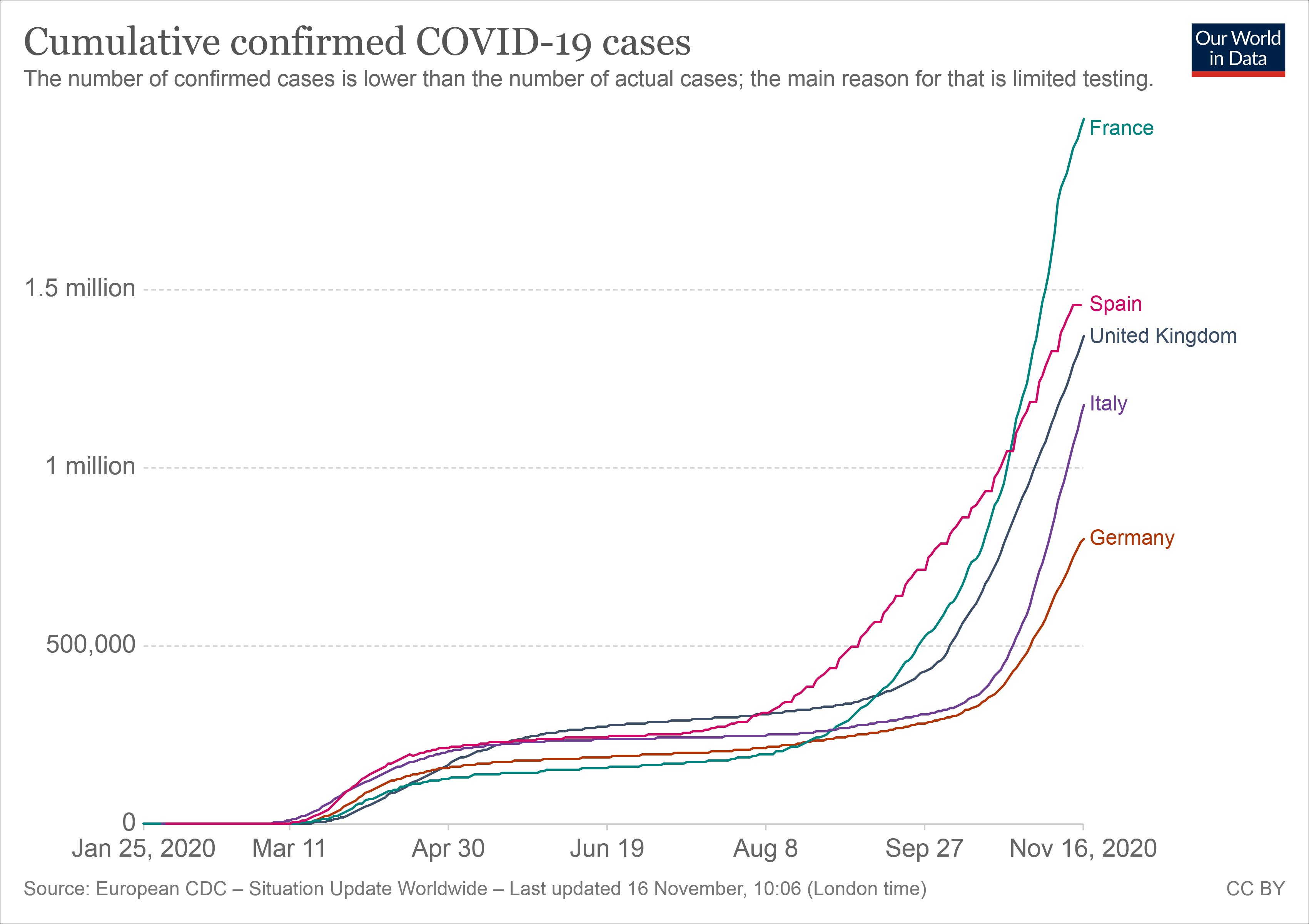 嚴峻的疫情迫使歐洲國家重啓嚴格的防疫措施。法國於10月30日正式實施為期一個月的全國“封城”;英國從11月5日進入第二次為期一個月的全國範圍內的“封城”,西班牙從10月25日宣佈第二次進入全國緊急狀態;意大利也頒佈了新的防疫法令,升級全國範圍的管控措施。德國總理默克爾15日稱,雖然當前實施的“封鎖”對穩定疫情起到了一定的作用,但“還是太慢”,該國每日的新增感染病例仍在增多,因此有必要繼續收緊相關措施。