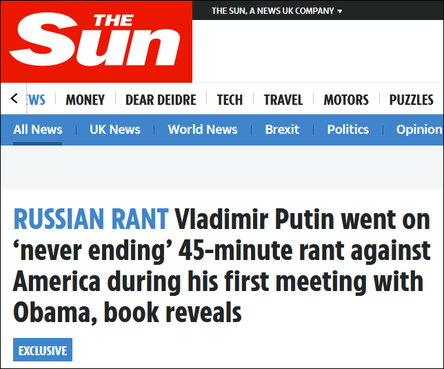 一位出版界人士告訴《太陽報》:“奧巴馬在談到普京擺姿勢拍照時,稱他看上去並不氣派,身材矮小,鼻子突出,眼神蒼白。”