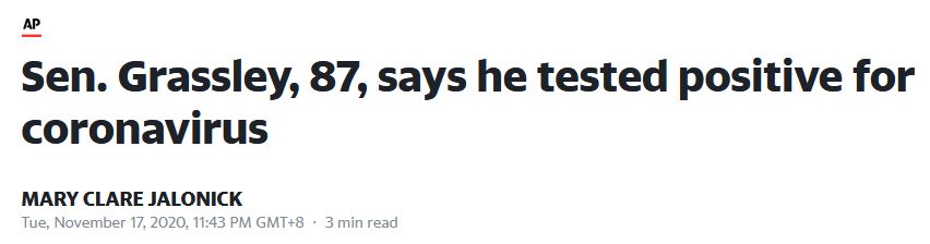 到了晚上,格拉斯利發推文説測試結果呈陽性。“我將遵守美國疾病預防控制中心的指導方針並繼續隔離。我感覺很好,會繼續在家中為艾奧瓦人民奮鬥。”