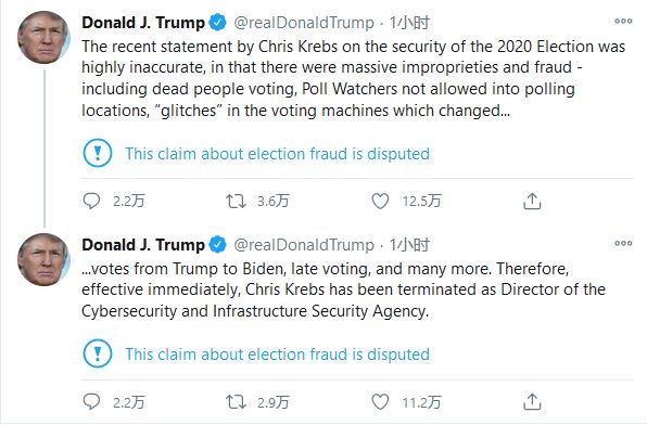 尚未承認敗選的特朗普在推文中説,克雷布斯就2020年總統大選的安全性發表了“非常不準確”的聲明,並聲稱,選舉有“大量的不當行為和欺詐行為”。