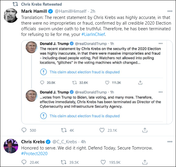 隨後,克雷布斯又轉發了一條推文。該推文以嘲諷的口氣“翻譯”了特朗普解僱克雷布斯的推特,寫道:“克里斯·克雷布斯最近的聲明非常準確,美國大選不存在不當行為或欺詐,所有經宣誓就職、且可信可靠的2020年選舉官員,都證實了這一聲明的真實性。因此,他因為拒絕為我,也就是你們的首席説謊官説謊,而被解僱了。”