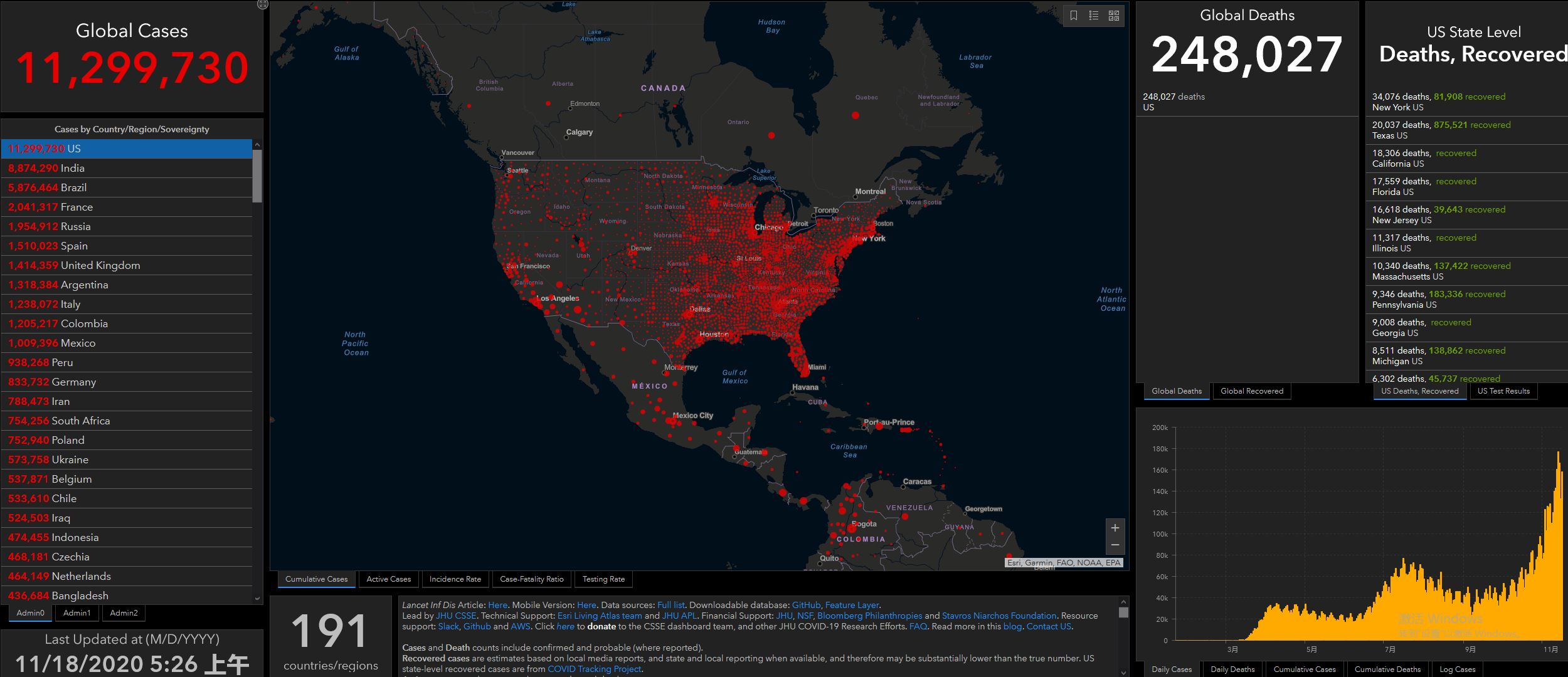 得克薩斯州是美國第一個累計新冠確診突破100萬例的州。據約翰斯·霍普金斯大學實時數據,截至北京時間11月18日5時26分,美國累計新冠確診病例超112萬例,累計死亡近25萬例。過去24小時,美國新增確診病例約13.5萬例,新增死亡病例1074例。
