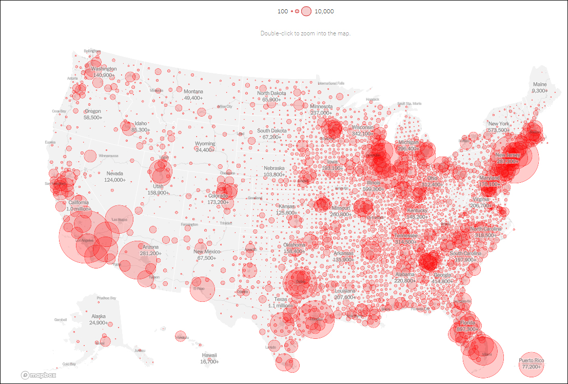 截至17日,美國各地累計確診新冠肺炎數量,(紅圈越大數字越高) 截圖:《紐約時報》