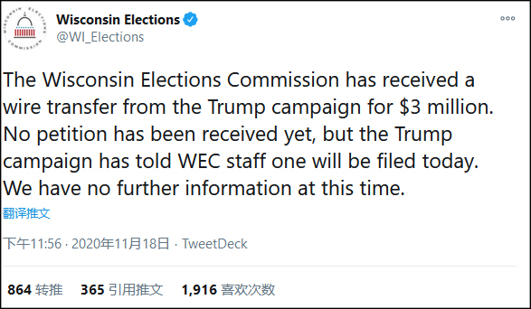 威斯康星州選舉委員會發推稱,已收到300萬美元費用