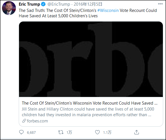 特朗普的次子埃裏克·特朗普也“落井下石”,於2016年12月5日發推嘲諷斯泰因稱,“斯泰因或克林頓重新計票需花費的錢足以挽救至少5000名兒童的生命。”