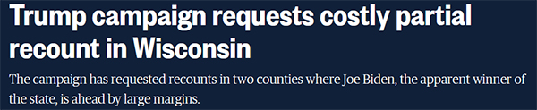 特朗普競選團隊法律顧問吉姆·特魯皮斯(Jim Troupis)打出“公正與透明”的大旗宣稱:“在重新清點合法選票前,我們沒法知道真正的結果……我們會一直為選舉爭取公平與透明度,確保美國民眾能信任威斯康星州和全美各地的公正結果。”