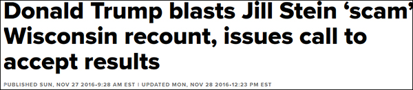 2016年11月,CNBC:“特朗普抨擊斯泰因在威斯康星州重新計票是騙局,要她接受結果”
