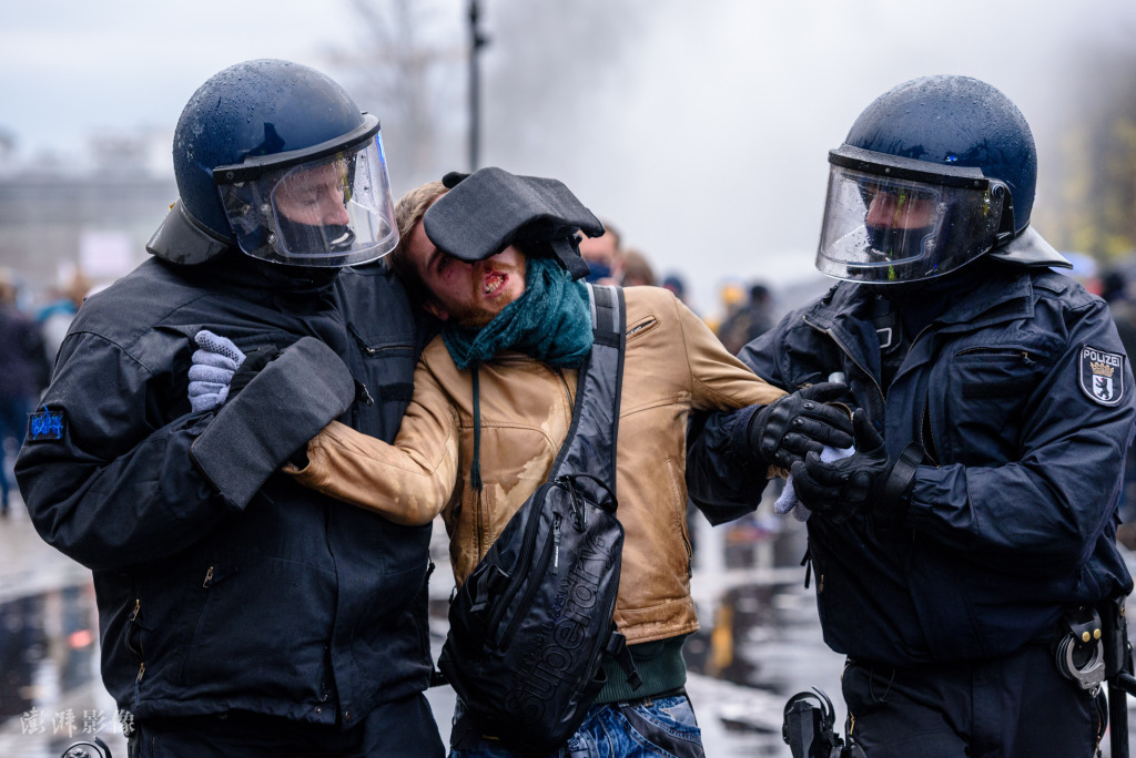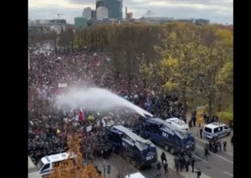 然而抗議人羣完全不管這些,一些抗議者高唱國歌,高呼“我們是人民”,試圖衝擊議會,中斷立法進程。德國警方選擇出動水炮車並使用胡椒噴霧,部分抗議者則試圖打傘守住“陣地”,他們投擲煙花、照明彈和其他物體進行反擊。