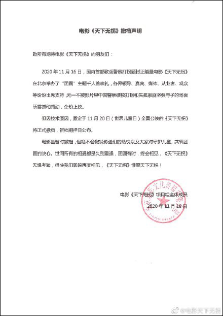 該微博還説:“世間所有的相遇都是久別重逢,團圓有時,終會相見,《天下無拐》無懼考驗,很快我們影院再度相見,惟願天下無拐!”