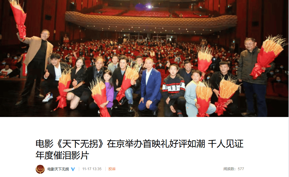 值得注意的是,@電影天下無拐 剛剛於17日發佈文章,稱16日下午,電影《天下無拐》在北京舉行了“團圓“首映禮,“千人見證年度催淚影片”。