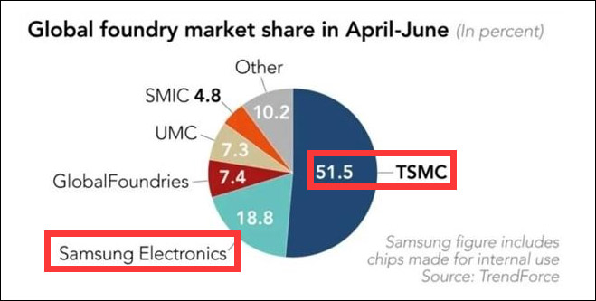 今年二季度,在全球晶圓代工領域,台積電份額過半,而三星佔有率不到二成。