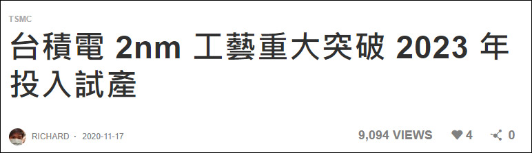 台媒近日的報道顯示,台積電在2nm製程上取得一項重大突破,有望在2023年下半年進行風險性試產,2024年步入量產。