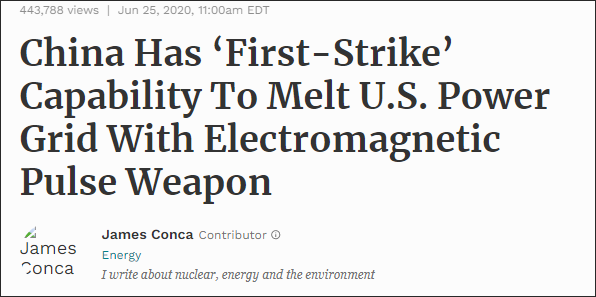 無獨有偶,美國的福布斯新聞,也於今年6月宣稱中國能“使用電磁脈衝武器”,對美國的電網實施“第一次核打擊”,讓其瞬間癱瘓。報道稱,美國國家國土安全局(NHS)的專家發佈報告稱,中國擁有某種“超級電磁脈衝武器”,不僅能防禦電磁脈衝攻擊,還能“瞬間融化”美國電網。