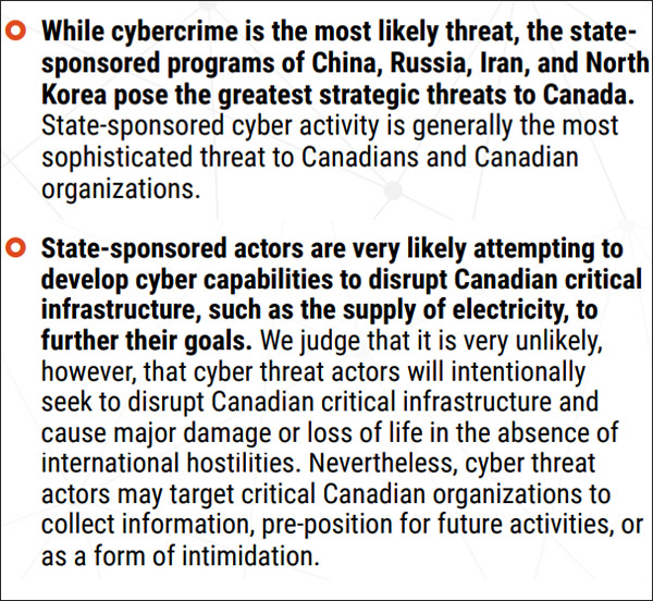 CSE在報告中宣稱,網絡犯罪是可能性最高的網絡威脅。中國、俄羅斯、伊朗和朝鮮“國家支持的項目”,對加拿大構成最嚴重的戰略威脅;這些“國家支持的活動”,很有可能借助互聯網能力,擾亂加拿大的核心基建設施,例如電力供應,來達成它們的目的。此外,網絡威脅行為可能針對加拿大核心的機構實體,收集情報,為將來的行動做準備,或者為了形成威懾。