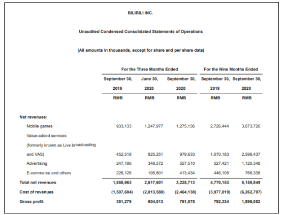 觀察者網·大橘財經訊(文/盧思葉 編輯/莊怡)11月19日,嗶哩嗶哩(NASDAQ: BILI,以下簡稱“B站”)公佈了截至2020年9月30日的第三季度未經審計的財務報告。財報顯示,B站三季度營收達32.3億元人民幣,同比增長74%;淨虧損為11億元,較上年同期擴大171%。