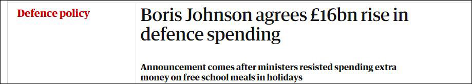 就在約翰遜宣佈增加軍費預算之前,政府拒絕為假期學校的免費餐食額外出資;英國的對外援助預算也將被削減數十億英鎊,佔比從國民收入的0.7%降至0.5%,已招致一些資深保守黨成員反對。