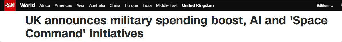 法新社20日稱,這筆預算讓英國成為“全歐洲軍費佔國內生產總值比例最重的國家(2.2%),在北約也僅次於美國。”英國《衞報》援引英國皇家國防安全聯合軍種研究所專家查莫斯的話稱,“這是國防預算自撒切爾政府以來的最大增幅,實際增長在10%-15%之間。”