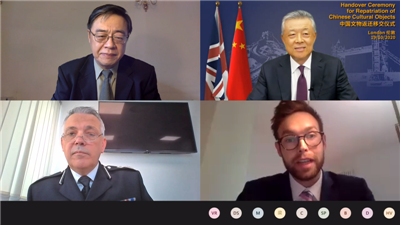 很高興出席中國文物返還移交儀式。這是我出使英國10多年來,第二次迎接中國文物“回家”。首先,我謹代表中國駐英國大使館,對英國政府和倫敦大都會警察局提供的鼎力支持表示衷心感謝!