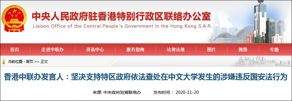 據香港中聯辦網站消息,11月20日,中央人民政府駐香港特別行政區聯絡辦公室發言人發表談話指出,11月19日,有人藉口不滿香港中文大學因應防疫需要將實體畢業典禮改為網上舉行,未經申請在校園內發起近百人的遊行集會。期間,少數人隨處塗污、損壞財物,涉嫌刑事毀壞,更有人高喊“港獨”口號,展示“光復香港、時代革命”“香港獨立”等標語和旗幟,氣焰囂張。對此,校方及時報警並兩度發表聲明予以譴責,特區政府教育部門及警方均指出有關活動涉嫌觸犯香港國安法,香港警務處國安處已展開調查。我們堅決支持特區國家安全機構採取果斷措施,迅速偵辦案件,依法作出處理。